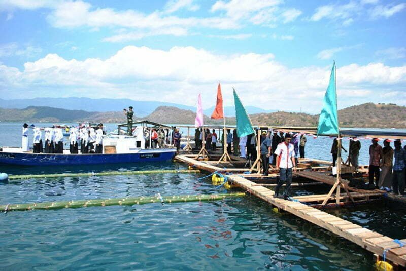 Para petugas upacara juga demikian, komandan upacara, dan penyanyi inti berada di atas perahu kecil. Sedangkan para tamu undangan menempati keramba jaring apung milik kelompok nelayan setempat. Bagi pengibar bendera yang terdiri dari 3 orang pelajar, melakukan pengibaran bendera dengan cara yang tak lazim pula. Mereka bertiga mengawali proses pengibaran dengan mendayung sebuah sampan kecil menuju lokasi tiang bendera yang telah dimodifikasi sedemikian rupa menggunakan sebuah keramba apung.