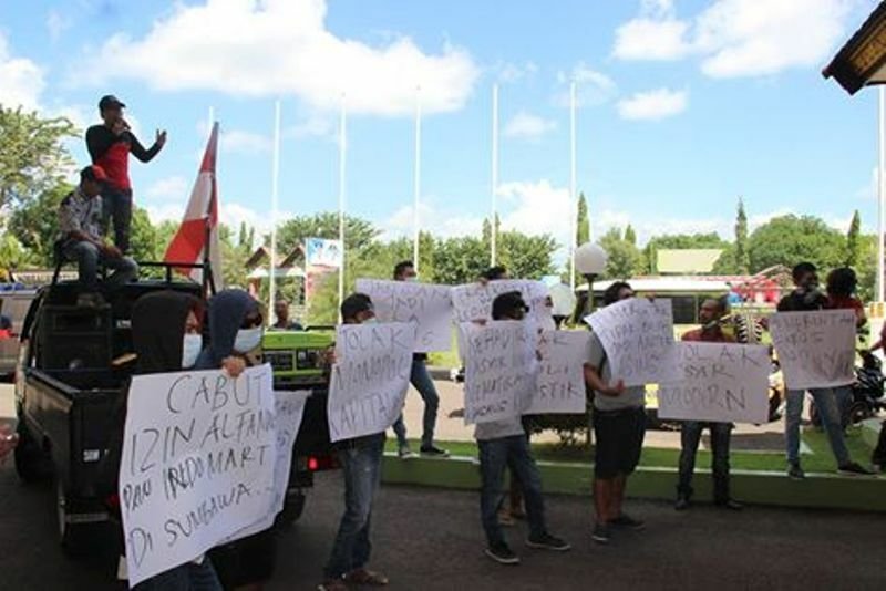 Demo Alfa MaratSumbawa Besar, Kabar Sumbawa—Puluhan massa yang tergabung dalam aliansi masyarakat Sumbawa, Kamis (28/4) melakukan aksi demontrasi ke gedung DPRD Sumbawa. Aksi itu dilatorbelakangi menjamurnya toko-toko berjejaring di Kabupaten Sumbawa, seperti Alfa Mart dan Indo Mart yang tumbuh subur dan disinyalir berdampak pada terpuruknya perekonomian pengusaha mikro kecil, kecil dan pengusaha menengah. Kedatangan para demonstran diterima Wakil Ketua DPRD Sumbawa, Dr. H. A Rahman Alamudy, SH, MSi. Ketua Komisi II, Abdul Rafiq didampingi sejumlah anggota Komisi II yakni,  M Berlian Rayes Sag, M Yasin Musama SAp dan I Nyoman Wisma.