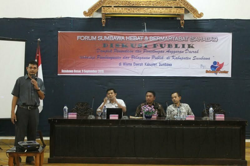 Sumbawa Besar, Kabar Sumbawa – Sahabat center telah melaksanakan diskusi publik pada hari jum’at tanggal 9 September 2016 di Wisma Daerah dengan tema “Dampak Penundaan dan Pemotongan Anggaran Daerah Terhadap Pembangunan dan Pelayanan Publik Di Kabupaten Sumbawa”. Diskusi ini menghadirkan pemateri dari kalangan Akademisi, Politisi, LSM dan pemerintah daerah yang dipandu langsung oleh koordinator Badan Pekerja Sahabat Center yaitu Lukman Hakim, S.P., M.Si. Peserta yang hadir yaitu dari beberapa kalangan yaitu dari SKPD, Politisi, Pemuda, tokoh masyarakat, mahasiswa dan beberapa unsur lainnnya.