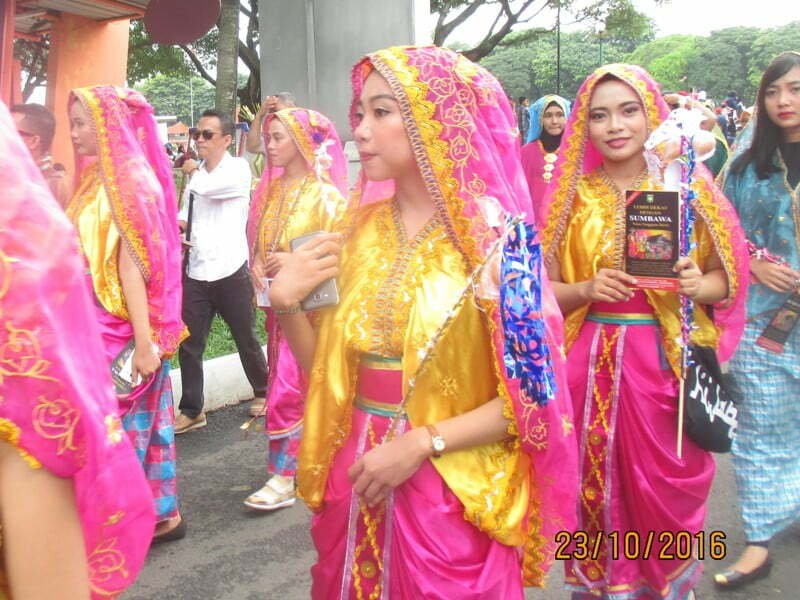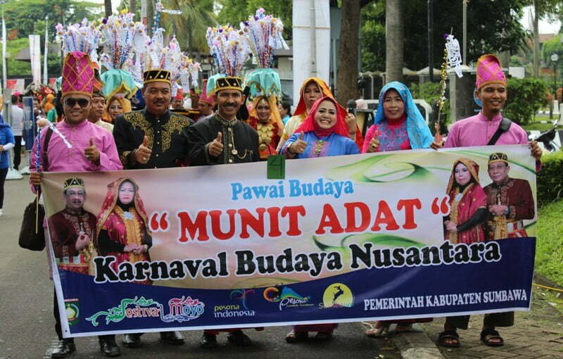 Jakarta, Kabar Sumbawa – Pawai budaya atau carnaval budaya menjadi salah satu event yang ditunggu pada setiap momentum festival atau pekan budaya. Pada Pekan Produk Budaya Nusantara Expo dan Forum 2016, Carnaval Budaya menjadi event pamungkas yang diselenggarakan dari Tugu Api Pancasila sampai ke gedung Theater Keong Mas Taman Mini Indonesia Indah, Minggu (23/10). “Munit Adat” sebagai tradisi masyarakat Sumbawa dalam memperingati kelahiran insan rahmatanli’alamin Nabi Muhammad SAW diperagakan dalam sebuah carnaval. Kali ini Disporabudpar Kabupaten Sumbawa yang menjadi motor agenda ini berkolaburasi dengan Ikatan Keluarga Sumbawa Jakarta Raya (IKASUM-JAYA). Ratusan peserta carnaval “Munit Adat” menjadi tontonan pengunjung Taman Mini Indonesia Indah.