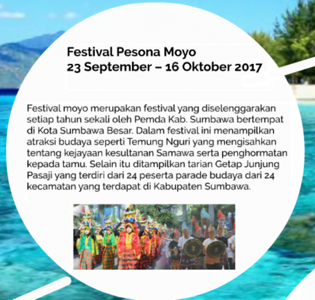 Dikatakan, dalam rancangan Kalender Event Promosi Pariwisata NTB Tahun 2017 tertuang “Festival Pesona Moyo” sebagai bagian dari agenda besar kepariwisataan NTB.
