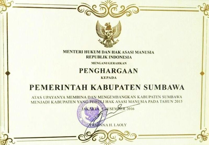 Bertempat di Gedung Negara Grahadi Surabaya, Kamis (8/12) Bupati Sumbawa yang diwakili oleh Sekretaris Daerah Kabupaten Sumbawa Drs. H. Rasyidi menerima Penghargaan Kabupaten Peduli HAM Tahun 2016. Penghargaan yang diserahkan langsung oleh Menteri Hukum dan HAM RI Bapak Yasonna H. Laoly tersebut adalah yang ke-3 kalinya di raih oleh Kabupaten Sumbawa.