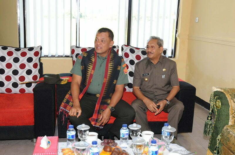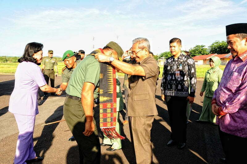 Sumbawa Besar, Kabar Sumbawa–Bupati Sumbawa HM. Husni Djbril, BSc menyambut kedatangan Panglima TNI Jenderal TNI gatot Nurmantyo beserta rombongan dengan mengalungkan Pabasa (kain khas sumbawa), Kamis (29/12/2016) di Bandara Sultan Muhammad Kaharuddin III Sumbawa Besar.