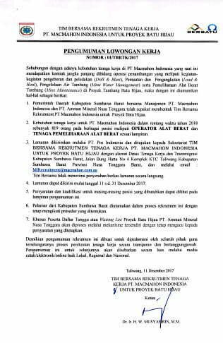 Sumbawa Barat – Sehubungan dengan adanya kebutuhan tenaga kerja dibidang operasi penambangan di proyek Batu Hijau, PT Macmohan Indonesia membuka kesempatan berkarir yang di utamakan bagi masyarakat Sumbawa Barat.