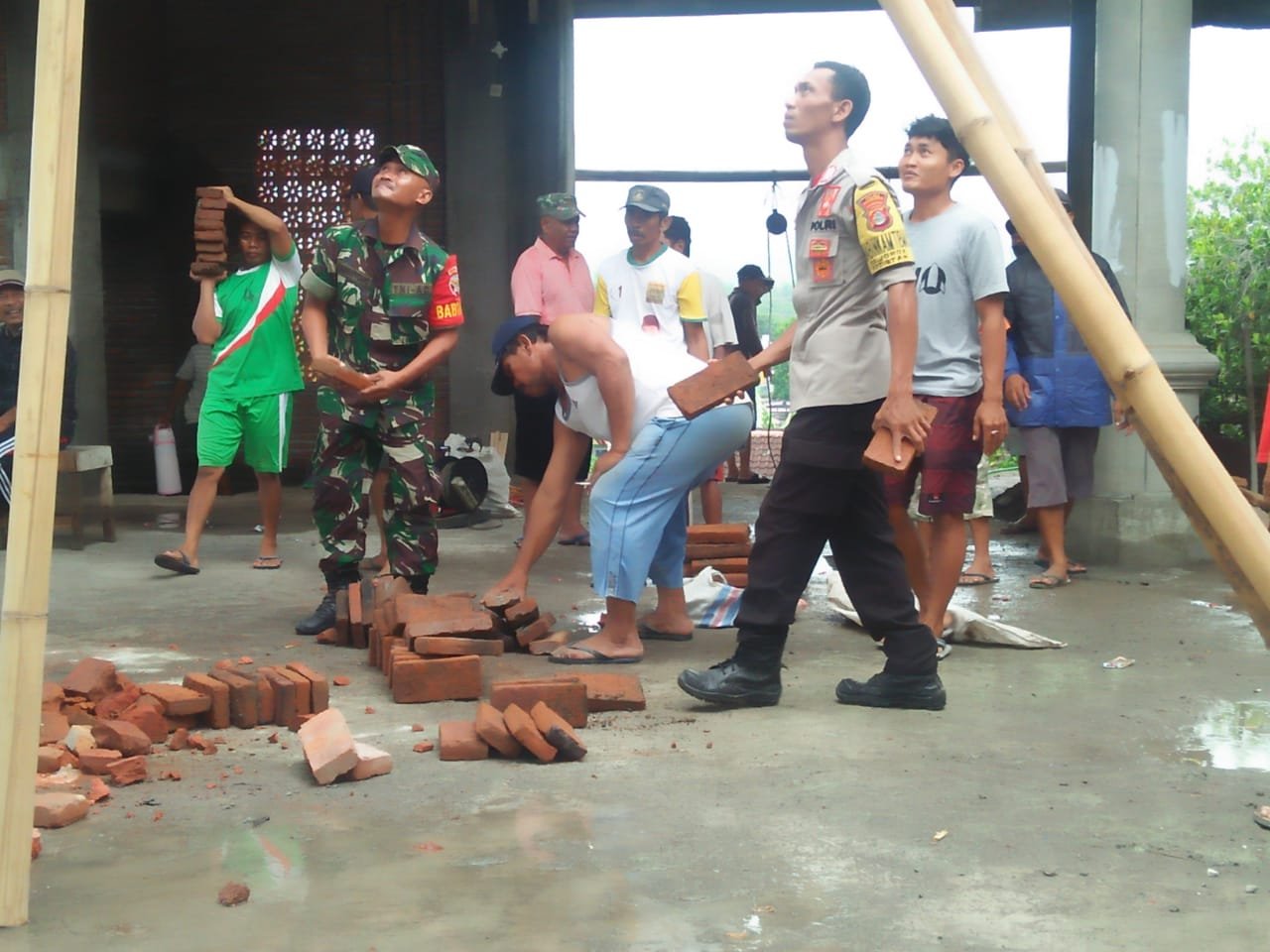 Mendengar informasi tersebut, Babinsa Jorok Koramil 1607-09/Utan Rhee Serka Sariwiyono bersama Babinkamtibmas mengajak warga binaannya untuk bergotong royong memasang kembali atap seng kubah Masjid.