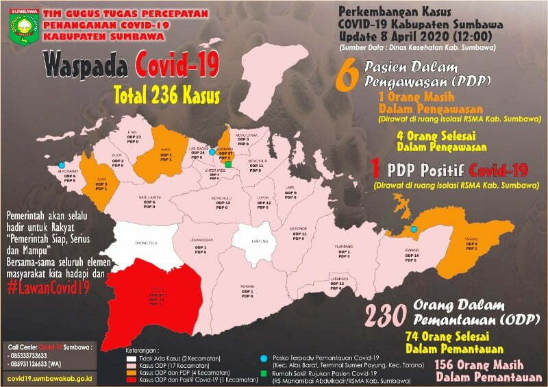 Lanjut Haji Bas sapaan akrab Sekda Sumbawa ini, hingga Rabu 08 April 2020, data Orang Dalam Pengawasan (ODP) sebanyak 230 orang, 74 ODP diantaranya sudah selesai dilakukan pemantauan dan masih tersisa 156 ODP yang menjalani karantina mandiri.