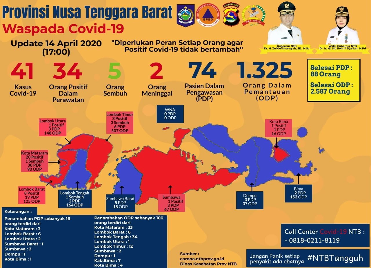 “Dengan adanya tambahan 4 kasus terkonfirmasi positif COVID-19 dan 1 orang sembuh maka jumlah pasien positif COVID-19 di NTB sampai hari ini sebanyak 41 orang, dengan perincian 5 orang sudah sembuh, 2 orang meninggal dunia, 34 masih positif dalam perawatan serta dalam kondisi kesehatan semakin baik,” terangnya.