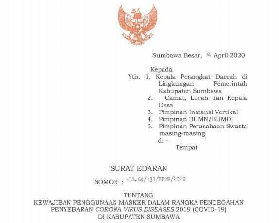 Surat Edaran (SE) tersebut terbit pada hari, Selasa 14 April 2020, dengan nomor 188.64/139/BPBD/2020, ditanda tangani oleh Bupati Sumbawa H. M. Husni Djibril, B.Sc.