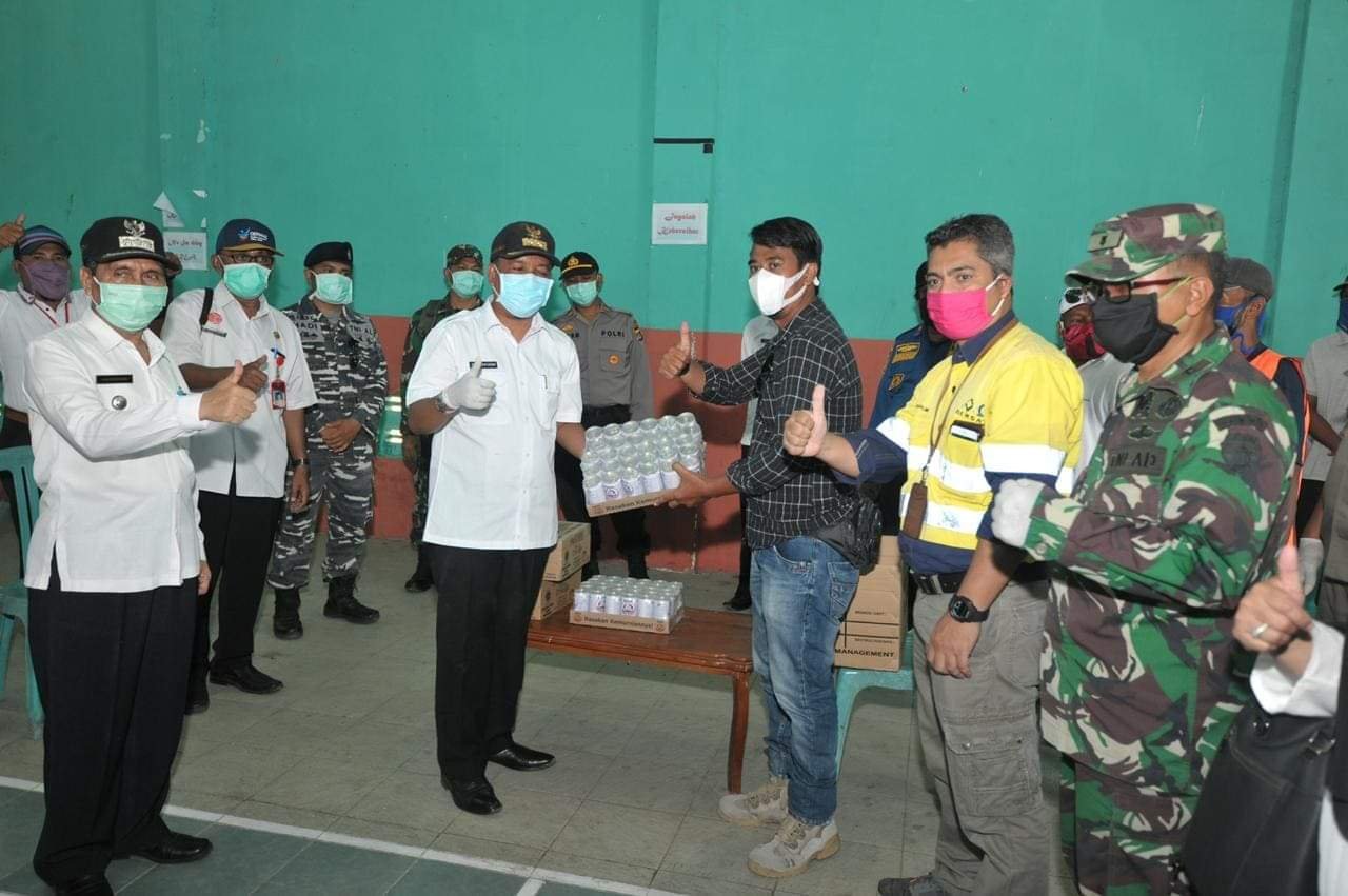 PT. AMNT menyerahkan bantuan kepada Wakil Bupati KSB, Fud Syaifuddin, di Posko Gugus Tugas, Desa Benete, Kecamatan Maluk, Rabu (15/4). Bantuan yang diberikan berupa masker bedah, alat pengukur suhu badan (thermo gun), sarung tangan medis, sabun cuci tangan, susu, serta vitamin. Selain diserahkan ke Gugus Tugas, bantuan ini juga akan didistribusikan kepada sejumlah Puskesmas di Kecamatan Maluk, Sekongkang, Tongo, dan Jereweh.