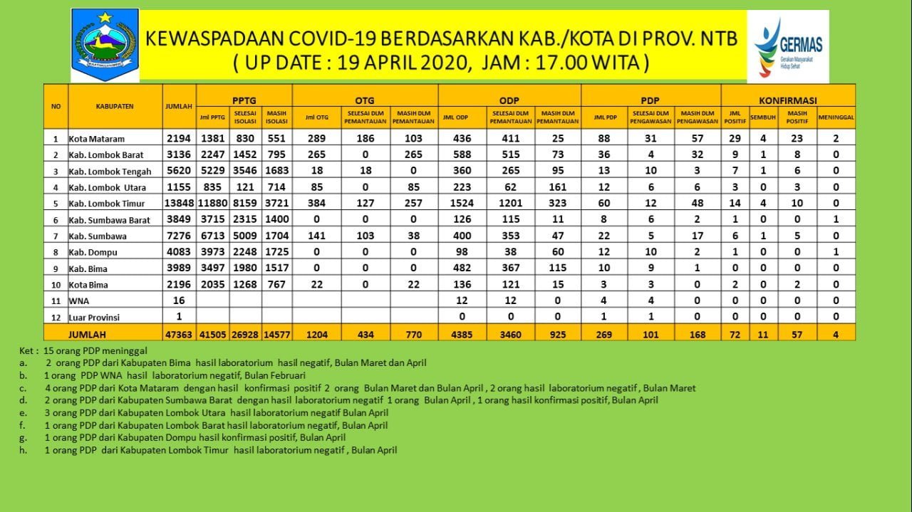 Ketua Pelaksana Harian Gugus Tugas Provinsi Nusa Tenggara Barat Drs. H. Lalu Gita Ariadi, M.Si dalam keterangan persnya, Minggu (19/4/2020), menyebutkan dari 48 sampel, 33 sampel negatif, 4 pasien sampel ulangan positif, dan 11 sampel kasus baru positif Covid-19.