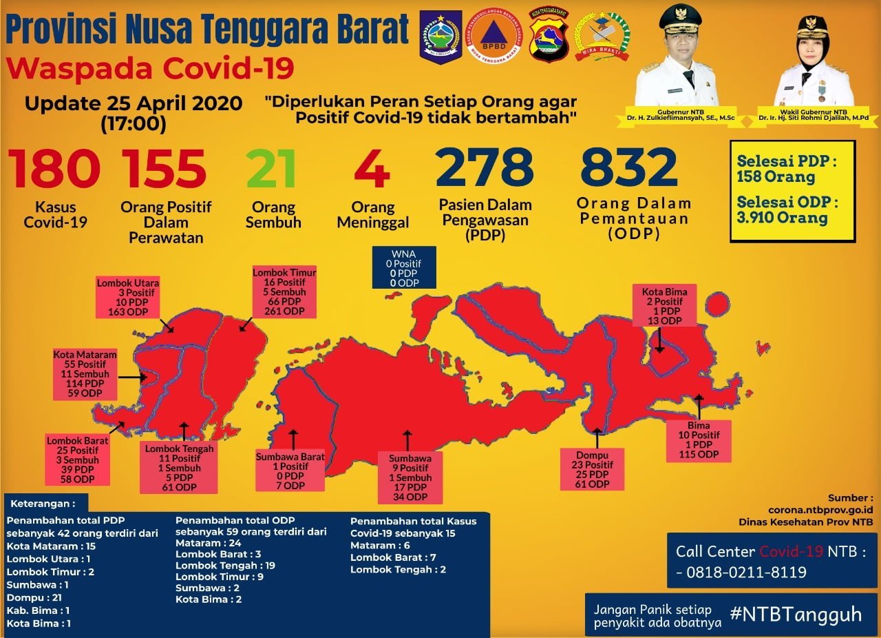 Dengan adanya tambahan 15 kasus baru terkonfirmasi positif Covid-19, 1 orang tambahan kasus sembuh, dan tidak ada kematian baru, maka jumlah pasien positif Covid-19 di Provinsi NTB sampai hari ini (25/4/2020) sebanyak 180 orang, dengan perincian 21 orang sudah sembuh, 4 (empat) meninggal dunia, serta 155 orang masih positif dan dalam keadaan baik.