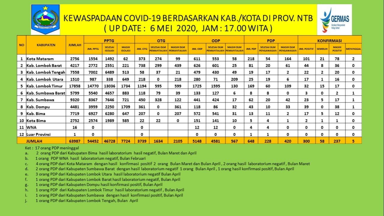 “Bahwa pada hari ini Rabu, 6 Mei 2020 telah diperiksa di Laboratorium RSUD Provinsi NTB dan Laboratorium Genetik Sumbawa Technopark sebanyak 163 sampel dengan hasil 146 sampel negatif, 6 (enam) sampel positif ulangan, dan 11 sampel kasus baru positif Covid-19,” kata Ketua Pelaksana Harian Gugus Tugas Provinsi NTB, Drs. H. Lalu Gita Ariadi, M.Si.