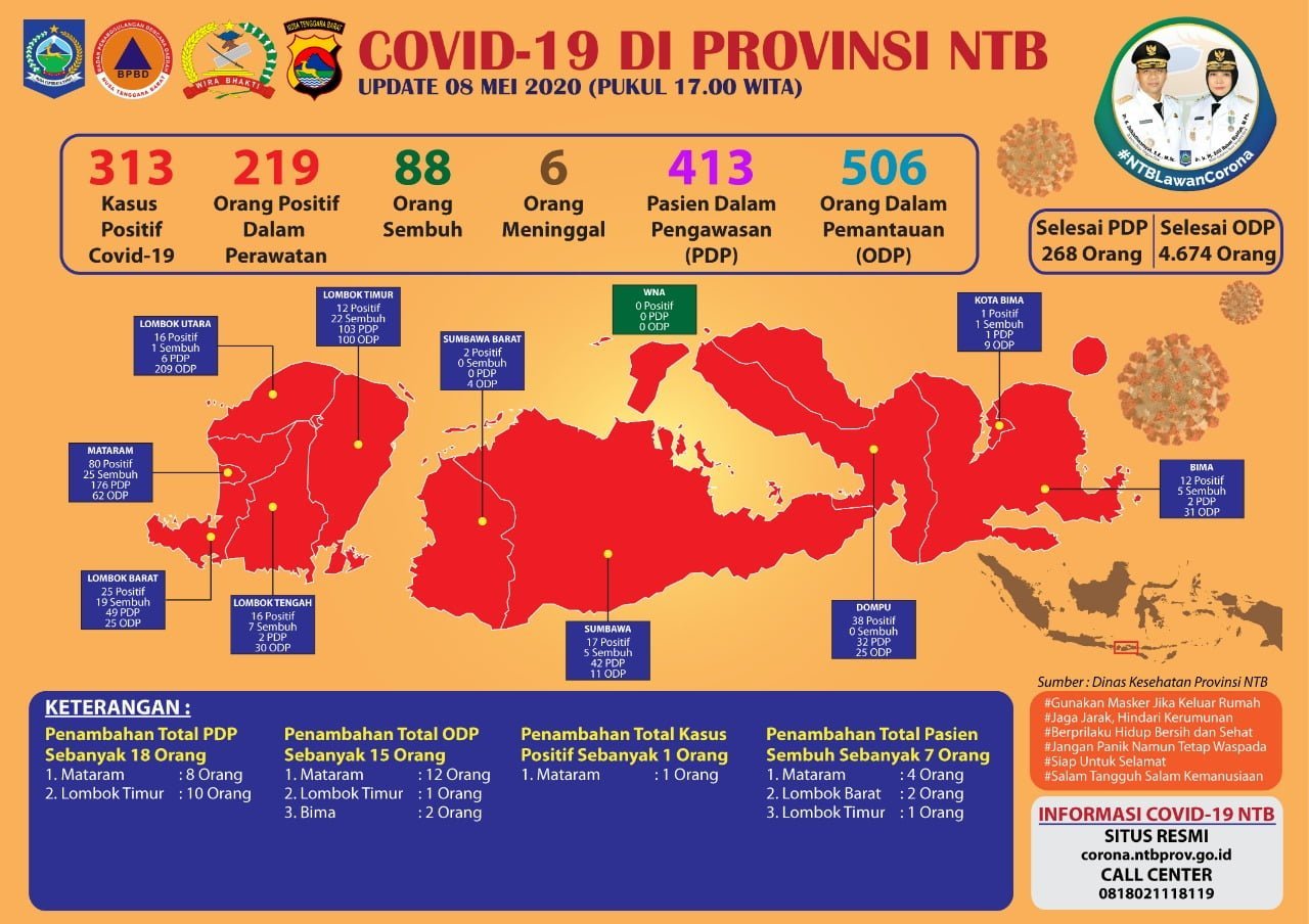 Dengan adanya tambahan 1 kasus baru terkonfirmasi positif, 7 tambahan sembuh baru, dan tidak ada kematian baru, maka jumlah pasien positif Covid-19 di Provinsi NTB sampai hari ini (8/5/2020) sebanyak 313 orang, dengan perincian 88 orang sudah sembuh, 6 meninggal dunia, serta 219 orang masih positif dan dalam keadaan baik.