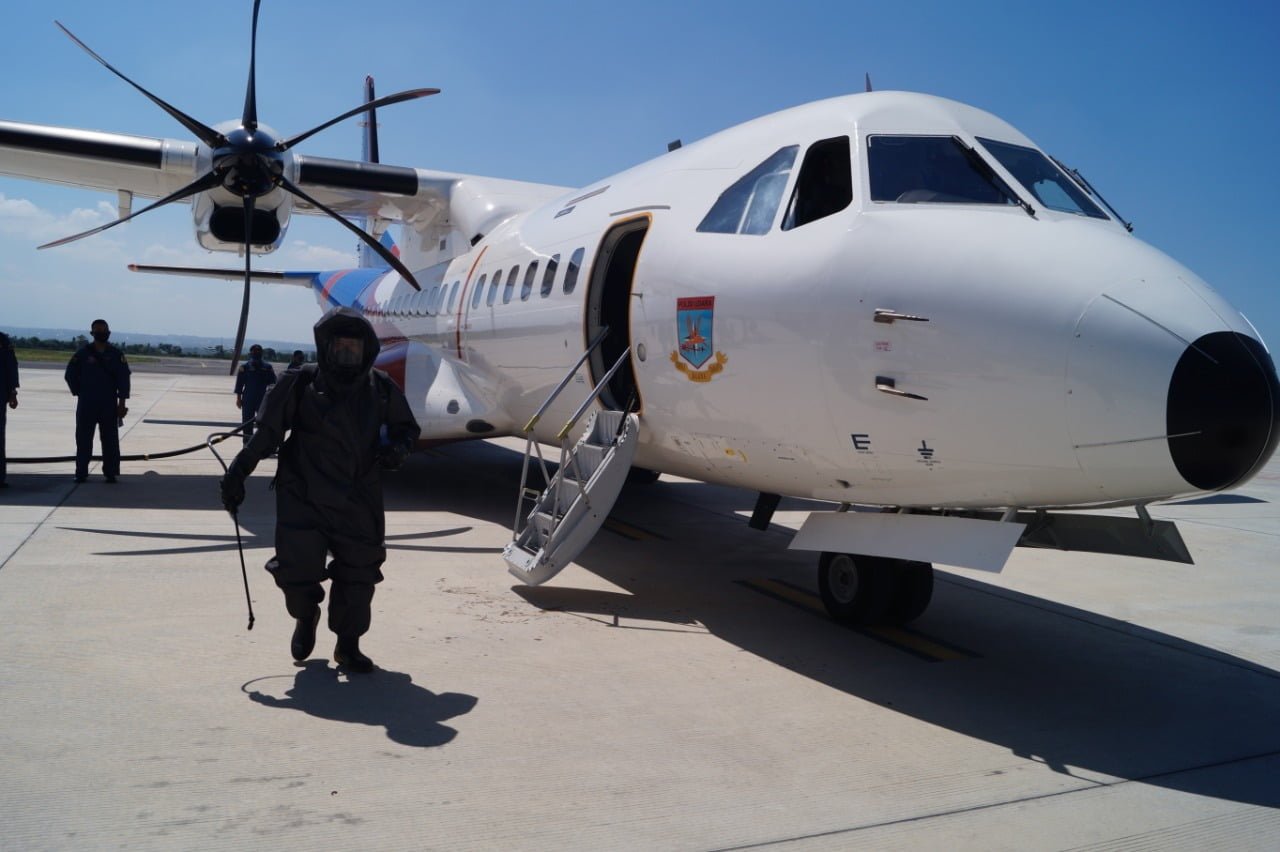 Penyemprotan ini tiada lain tiada bukan sebagai bentuk antisipasi SOP pembersihan ruangan ditengah merebaknya Virus corona di Indonesia. Selain itu juga sebagai bentuk Pam VIP Detasemen Gegana untuk menyisir seluruh sudut pesawat agar mengantisipasi hal – hal yang mencurigakan. (KS)