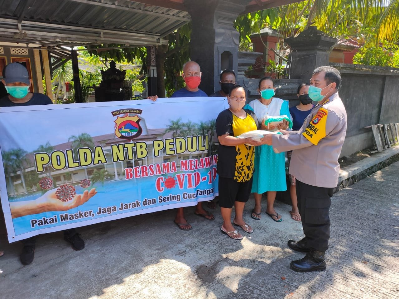 Kota Mataram dan menyalurkan bantuan sembako Polda NTB sebanyak 30 paket (150) kg, perpaket 5 kg beras yang diterima oleh kepala lingkungan yang diperuntukan bagi masyarakat yang tidak masuk dalam bantuan JPS Pemerintah.