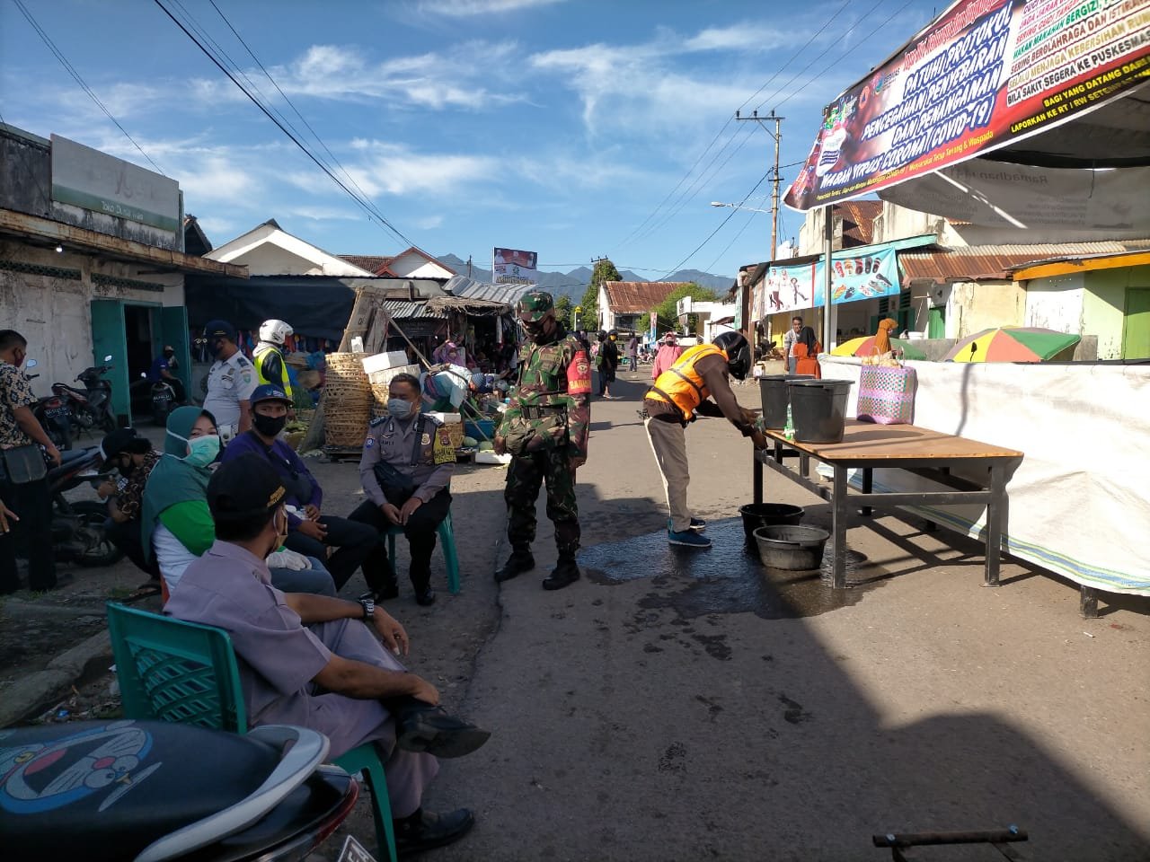 Di dalam kegiatan pencegahan penularan Covid-19 di Pasar, Babinsa Koramil 02/Empang melaksanakan Pangamanan dan penataan para pedagang Pasar di Posko Pasar Baru Empang serta Babinsa Koramil 09/Utan Rhee melaksanakan pengamanan di Posko Pasar Utan Kecamatan Utan Kabupaten Sumbawa. Kamis (04/06/2020).