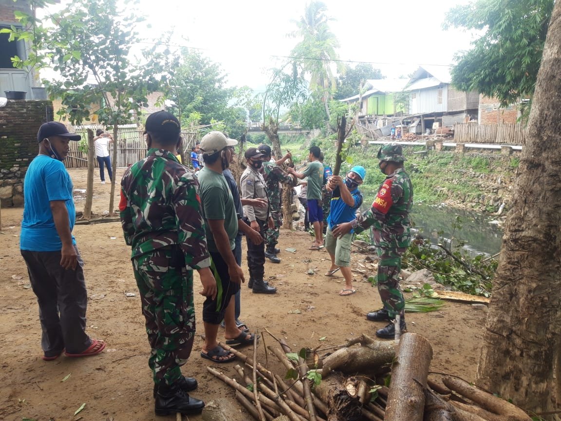 bersama aparat lainya dan masyarakat sekitar bahu membahu melaksanakan gotong royong pembersihan dan perbaikan fasilitas umum, rumah warga masyarakat terdampak yang sebagian besar mengalami kerusakan atap rumah. yang telah diksanakan dari kemarin dilanjutkan hari ini senin (23/11/2020 ).