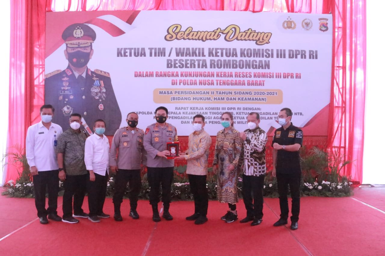 Mataram – Kepala Kepolisian Daerah NusaTenggara Barat Irjen Pol Mohammad Iqbal S.I.K, M.H dan Kepala Badan Narkotika Nasional (BNN) NTB Brigjen Pol Drs Gde Sugianyar Dwi Putra menerima kunjungan kerja Wakil Ketua Komisi III DPR RI berserta sejumlah Anggota komisi III DPR RI lainnya, di Mapolda NTB pada Senin (14/12/2020).