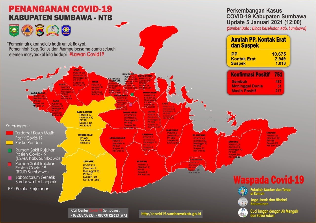 Sumbawa Besar, Kabarsumbawa.com – Data Dinas Kesehatan (Dikes) Kabupaten Sumbawa mencatat, jumlah kasus positif covid-19 mencapai 751 kasus. Dari jumlah ini, sebanyak 483 sembuh, 51 meninggal dunia, dan 217 masih positif.