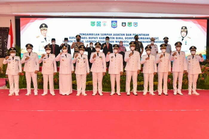 Enam pasangan kepala daerah yang dilantik Gubernur, yaitu, Walikota/Wakil Walikota Mataram H. Mohan Roliskana, .S.Sos., M.H., dan TGH. Mujiburahman., Bupati/Wakil Bupati Lombok Utara H. Djohan Sjamsu, S.H., dan Danny Karter Febrianto R, S.T., M.Eng., Bupati/Wakil Bupati Lombok Tengah H Lalu Pathul Bahri dan H M Nursiah, Bupati/Wakil Bupati Sumbawa Barat Dr. Ir. H. W. Musyafirin, MM dan Fud Syaifuddin, ST, Bupati/Wakil Bupati Dompu Kader Jaelani dan H. Syahrul Parsan, ST., MT, dan Bupati/Wakil Bupati Bima Hj. Indah Damayanti Putri, S.E dan Drs. Dahlan M. Noer.