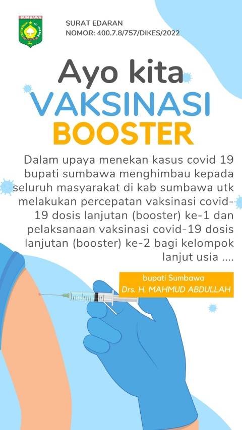 Maka Pemerintah Kabupaten Sumbawa akan melaksanakan percepatan vaksinasi dosis lanjutan (booster) ke-1 dan Pemberian vaksinasi dosis lanjutan (booster) ke-2 bagi lanjut usia (lansia) dengan interval waktu 6 (enam) bulan dari pemberian vaksinasi dosis lanjutan (booster) ke-1, dengan strategi proaktif, persuasif, terfokus, dan terkoordinir. Berkenaan dengan hal tersebut, seluruh lapisan dan kalangan masyarakat Kabupaten Sumbawa dihimbau untuk ikut mendukung dan menyukseskan program pemerintah dimaksud demi terciptanya masyarakat tana samawa yang tetap produktif dan lebih aman dari Covid-19.