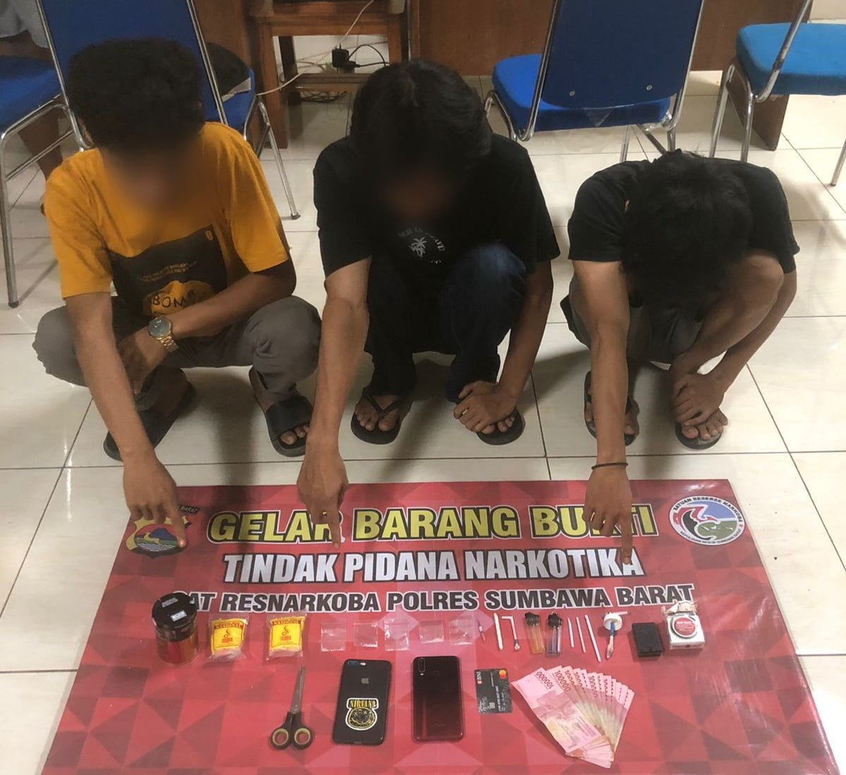 Sumbawa Barat, Kabarsumbawa.com – Tim Opsnal Satres Narkoba Polres Sumbawa Barat berhasil meringkus 3 orang terduga pelaku tindak pidana narkotika. Dari tangan para terduga, berhasil diamankan barang bukti 1,71 gram sabu hingga uang tunai jutaan rupiah.