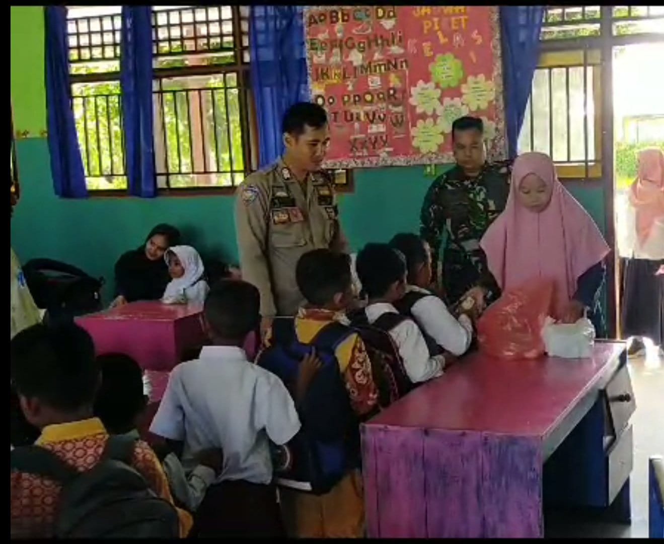 “selain tugasnya mengamankan desa dia selalu menyempatkan diri untuk berkunjung ke sekolah silaturrami dengan kami staf pengajar dan membagikan susu buku pada anak, kami sangat menerima baik dan mengapresiasi apa yang dilakukan dan berharap kegiatan tersebut tetap berlanjut”ucap Sabirin. (KS)