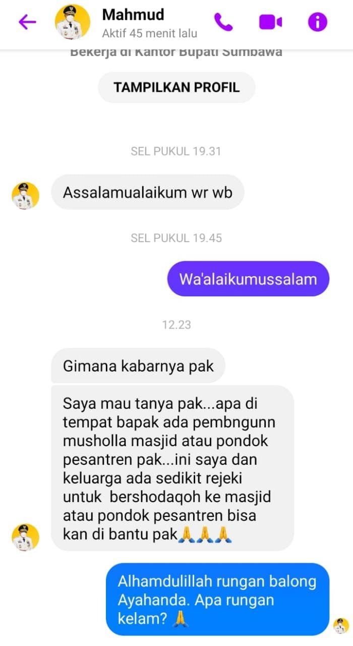 Baru-baru ini, sebuah akun media sosial Facebook mencatut nama Bupati Sumbawa Drs. H. Mahmud Abdullah, diduga melakukan percobaan penipuan. Skema penipuannya hampir sama dengan sebelumnya, yaitu korban akan diiming-imingi bantuan secara pribadi. Dimana, ketika korban sudah terkelabui, maka akan diminta untuk mengirimkan sejumlah uang kepada pelaku.