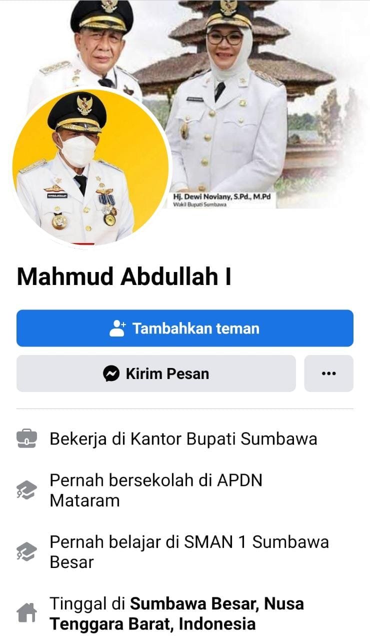 Melalui kesempatan ini, ia menegaskan bahwa Bupati Sumbawa hanya memiliki satu akun facebook resmi yakni Mahmud Abdullah (https://www.facebook.com/mahmud.abdullah.3720?mibextid=ZbWKwL), dan halaman resmi Drs. H. Mahmud Abdullah (https://www.facebook.com/DrsHajiMahmudAbdullah?mibextid=ZbWKwL).