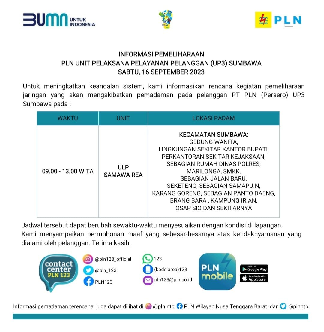 Beranda Peristiwa Informasi Pemeliharaan PLN UP3 Sumbawa PeristiwaInformasi Pemeliharaan PLN UP3 Sumbawaaly0 min baca14 September 202314 September 2023×Informasi Pemeliharaan PLN UP3 SumbawaSebarkan artikel ini Artikel TerkaitPeristiwaRibuan Warga Terdampak Banjir di SumbawaHukum & KriminalPohon Tumbang, Polsek Labuhan Badas Pastikan Jalur Lintas Tetap AmanPeristiwaDesa Labuhan Bontong Diterjang BanjirPeristiwaPembukaan Tahun 2026, Ratusan Wisatawan Mancanegara Datang ke SumbawaPeristiwaINFO KEHILANGAN BPKBPeristiwaWarga Kelurahan Lempeh Temukan Janin Bayi