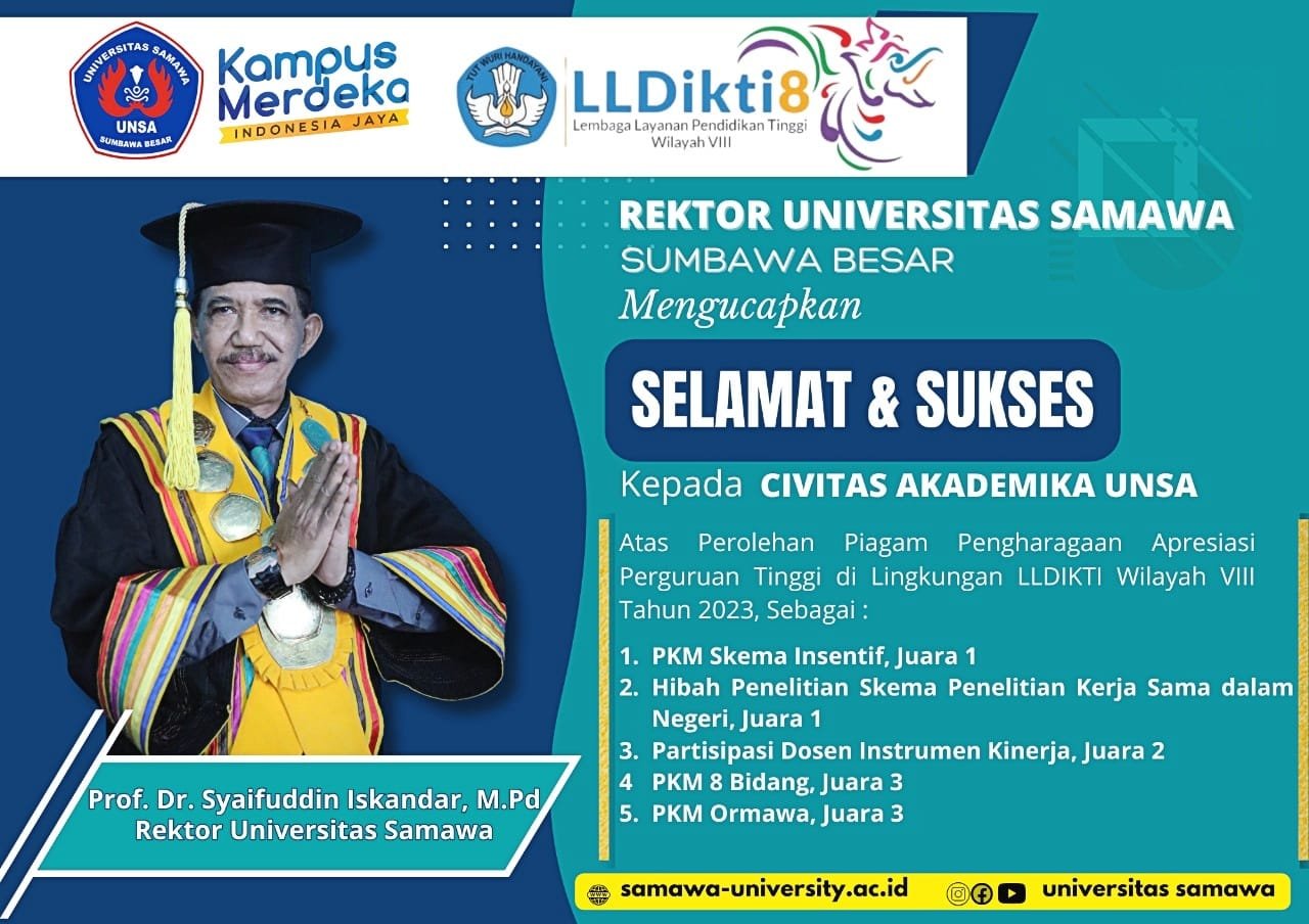 Sumbawa Besar, Kabarsumbawa.com – Universitas Samawa (UNSA) Sumbawa Besar kembali mengukir prestasi gemilang. Sebanyak 5 Piagam Apresiasi Perguruan Tinggi diberikan oleh Lembaga Layanan Pendidikan Tinggi (LLDIKTI) Wilayah VIII Bali dan NTB pada Awards LLDIKTI8 Tahun 2023. Prestasi tersebut sekaligus menjadi kado spesial DeisNatalis UNSA ke 25.