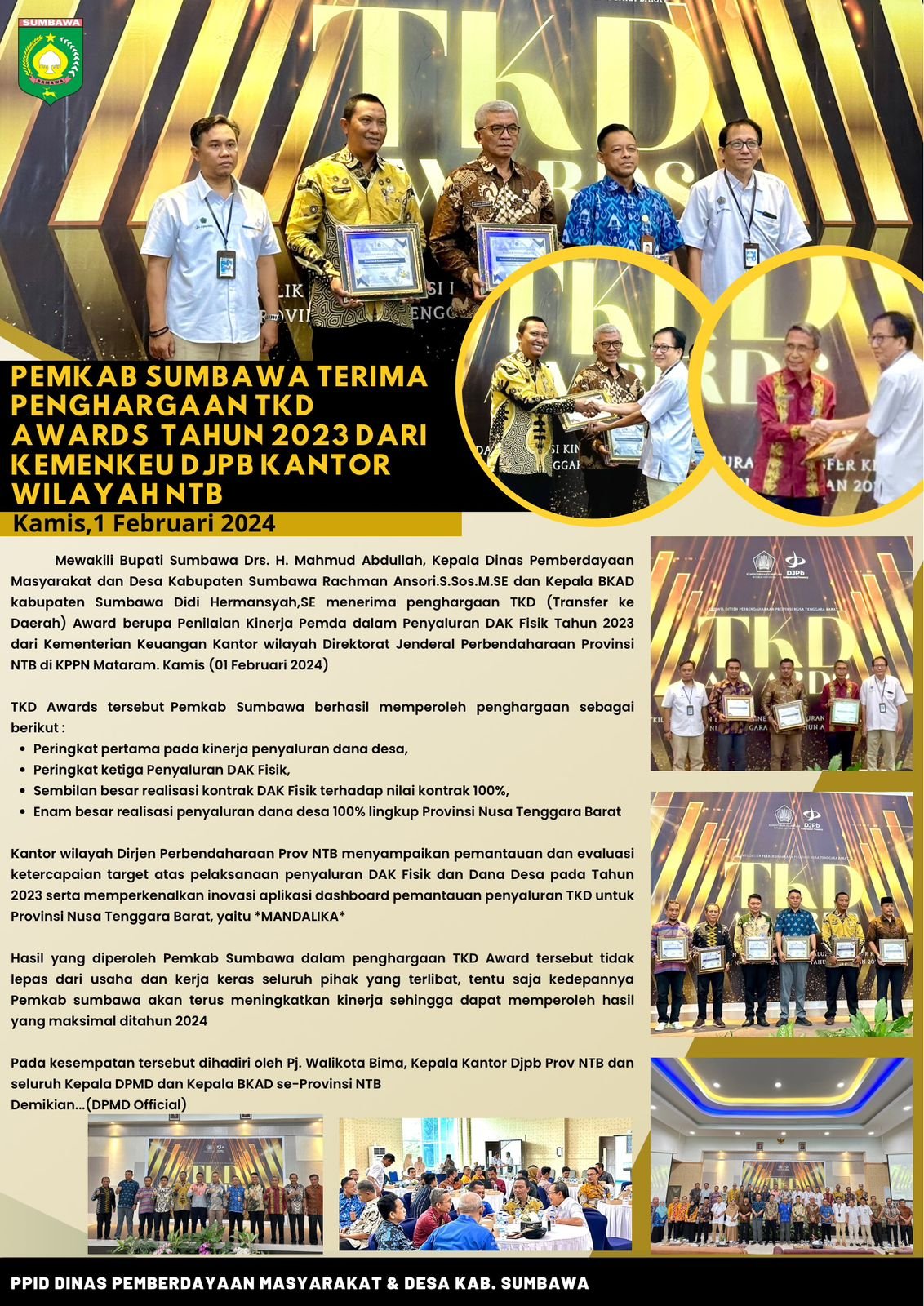 Adapun TKD Awards tersebut Pemkab Sumbawa berhasil memperoleh penghargaan sebagai antara lain, Peringkat pertama pada kinerja penyaluran dana desa. Peringkat ketiga Penyaluran DAK Fisik. Sembilan besar realisasi kontrak DAK Fisik terhadap nilai kontrak 100%. Enam besar realisasi penyaluran dana desa 100% lingkup Provinsi Nusa Tenggara Barat.