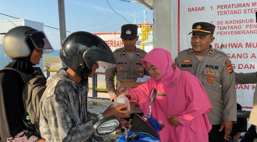 Sumbawa Barat, Kabarsumbawa.com – Personil Polsek dan Bhayangkari KPL Tano, berbagi takjil kepada masyarakat pengguna jasa, pegawai pelabuhan dan crew kapal di Pelabuhan Poto Tano, Kabupaten Sumbawa Barat.
