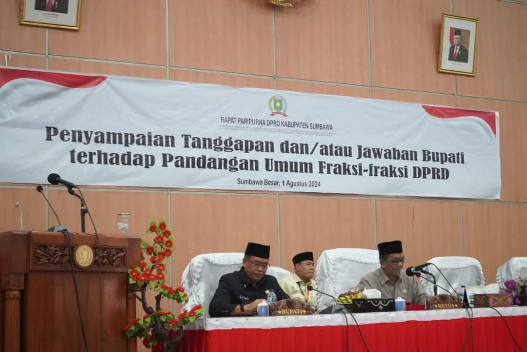 Hal ini disampaikan oleh bupati dalam dalam jawaban tertulisnya atas pandangan Fraksi-fraksi DPRD Sumbawa yang disampaikan melalui Sekda Sumbawa Dr. Budi Prasetyo dalam paripurna DPRD Sumbawa, Kamis (1/8/24).