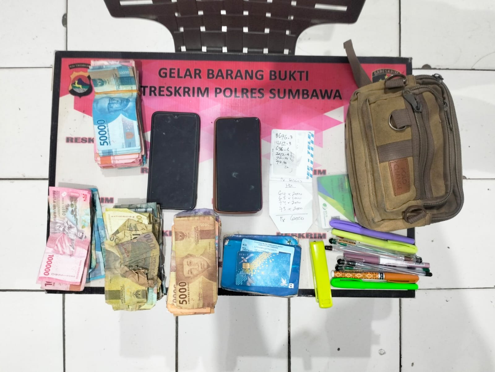 Polisi menangkap terduga pelaku beserta sejumlah barang bukti diantaranya 116 lembar uang pecahan Rp. 100.000, 56 lembar uang pecahan Rp. 50.000, 8 lembar uang pecahan Rp. 10.000, 25 lembar uang pecahan Rp. 5.000, 36 lembar uang pecahan Rp. 2.000, 27 lembar uang pecahan Rp. 1.000, 2 Buah buku rekening bank BRI, 1 Buah Kartu Atm Bank BRI, 1 Buah Kartu BPJS ketenagakerjaan, 6 lembar sobekan nomor jual, 9 buah bolpoin, 1 buah reksel, 1 buah tas pinggang warna cream, dan 1 buah hp Vivo 1820 warna merah.