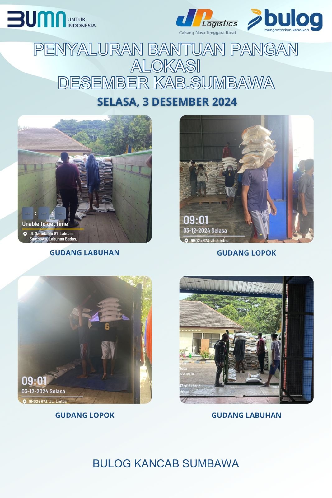 Sumbawa Besar, Kabarsumbawa.com – Bulog Kantor Cabang (Kancab) Sumbawa telah melaksanakan tugas penyaluran Bantuan Pangan (Bapang) Cadangan Beras Pemerintah (CBP) Tahun 2024. Saat ini, sedang berlangsung penyaluran tahap terakhir di pada bulan Desember.