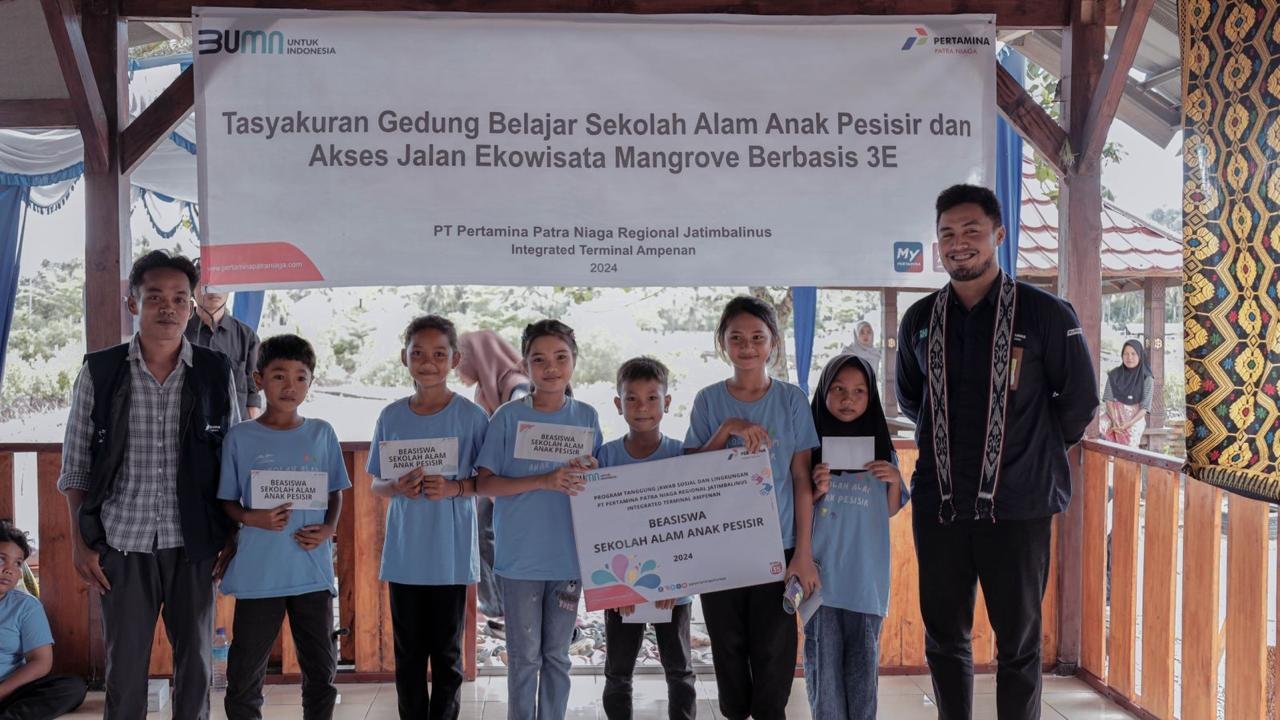 Lombok, Kabarsumbawa.com – PT Pertamina Patra Niaga Integrated Terminal Ampenan (IT Ampenan) menggelar acara penyerahan beasiswa dan tasyakuran peresmian gedung sekolah dalam rangkaian Program Tanggung Jawab Sosial dan Lingkungan (TJSL) Sekolah Alam Anak Pesisir. Acara digelar di area Ekowisata Mangrove Bagek Kembar, Kecamatan Sekotong, Kabupaten Lombok Barat. Acara ini dihadiri oleh stakeholder dari berbagai sektor yaitu Dinas Perpustakaan dan Kearsipan Provinsi NTB, Dinas Perpustakaan dan Kearsipan Kabupaten Lombok Barat, Kepala Desa Cendi Manik, Kepala Desa Persiapan Empol, Yui Tool Kaihatsu Labo Japan, Better Together Indonesia Foundation, POKDAWIS Bagek Kembar, dan Sanggar Belajar Jalan Pulang.