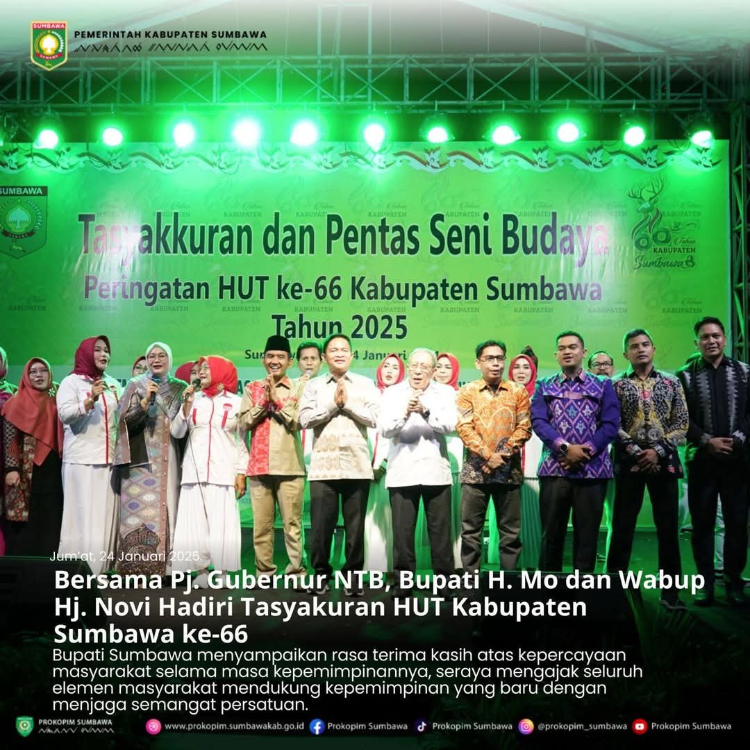 Sumbawa Besar, Kabarsumbawa.com – 24 Januari 2025 – Dalam rangka memperingati Hari Ulang Tahun (HUT) ke-66 Kabupaten Sumbawa, Pemerintah Kabupaten Sumbawa menggelar Tasyakuran dan Pentas Seni Budaya di Halaman Kantor Bupati Sumbawa, Jumat (24/1). Acara ini dihadiri oleh Penjabat (Pj) Gubernur NTB, Bupati dan Wakil Bupati Sumbawa, Wakil Bupati Sumbawa terpilih periode 2025-2030, sejumlah pejabat Pemprov NTB dan Kabupaten Sumbawa, segenap anggota Forkopimda Kabupaten Sumbawa; serta tamu undangan lainnya.