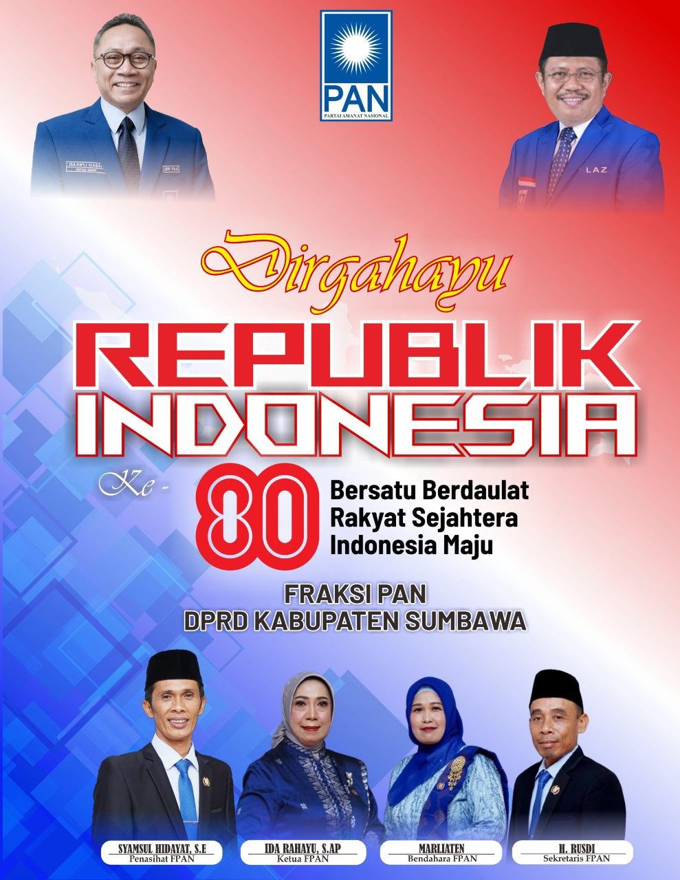 Beranda Iklan FRAKSI PAN DPRD SUMBAWA UCAPKAN DIRGAHAYU RI KE 80 IklanFRAKSI PAN DPRD SUMBAWA UCAPKAN DIRGAHAYU RI KE 80aly0 min baca17 Agustus 2025×FRAKSI PAN DPRD SUMBAWA UCAPKAN DIRGAHAYU RI KE 80Sebarkan artikel ini Pos TerkaitIklanPengumuman Wisuda Angkatan Ke-XXII Univesitas SamawaIklanPengumuman Penandatanganan Akad Kredit 30 dan 31 Agustus 2025 BNI Cabang SumbawaIklanFRAKSI GELORA DPRD KABUPATEN SUMBAWA UCAPKAN DIRGAHAYU RI KE 80IklanPengumuman BNI Kantor Cabang SumbawaBawaslu Sumbawa Ucapkan Terima Kasih Kepada Pengawas Adhoc, Panwascam dan Jajaran Sekretariat Atas Suksesnya Pemilu Serentak 2024IklanPENGUMUMAN : Salinan SK Penetapan Paslon Bupati/Wakil Bupati Sumbawa Terpilih 2024