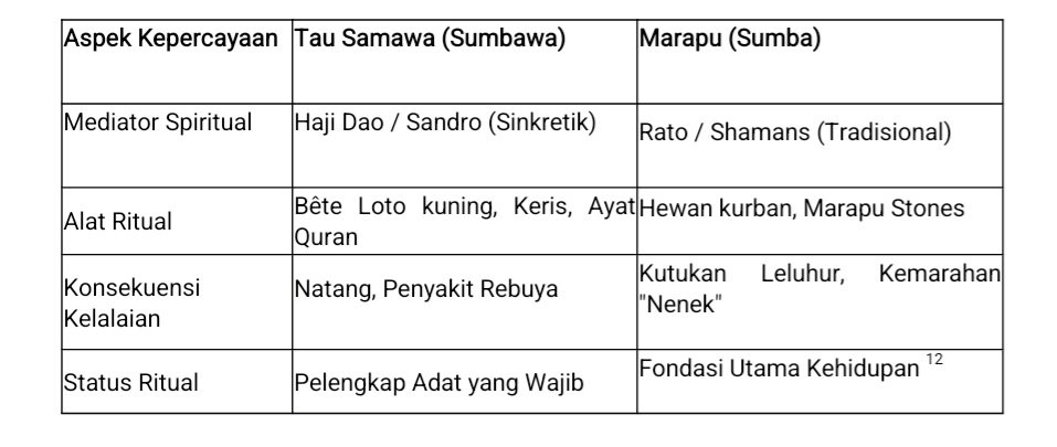 Meskipun naskah ini berfokus pada masyarakat Samawa, penting untuk membandingkannya dengan sistem kepercayaan tetangga, seperti Marapu di Sumba, untuk memahami kekhasan Natang. Di Sumba, kepercayaan Marapu sangat menekankan pada pemujaan arwah leluhur sebagai media perantara dengan Tuhan.11 Dalam tradisi Marapu, kegagalan memenuhi syarat ritual juga berakibat pada “mala petaka” atau kutukan.